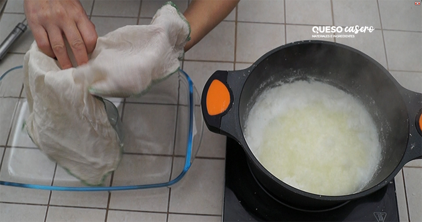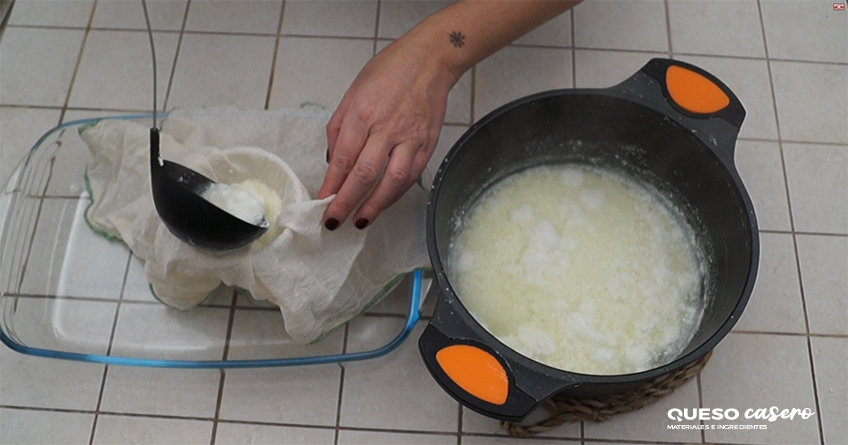 Deja reposar durante 10-15 minutos para que baje de temperatura y comienza a colar. Saca el requesón que se habrá quedado en la parte superior de la sopera con un colador o cazo agujereado a una tela quesera. Escurre bien presionando la tela y ya estará listo.